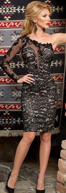 ORIGINAL HIGH QUALITY LACE TUBE LINED AND VERY ELASTIC NUDE LOOK SINGLE-SLEEVED EFFECT. RIGHT ARM WITH SEMI-TRANSPARENT TULLE PART AND SEWED MACRAME 'LACE.