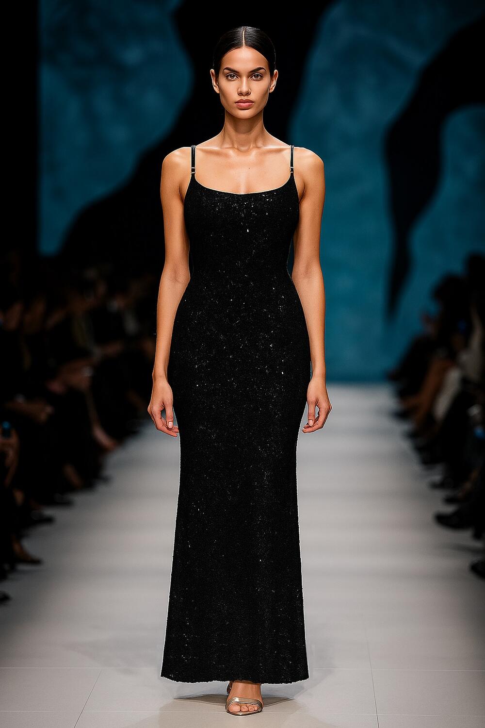 LONG DRESS IN BLACK MICRO SEQUINS. FULLY LINED IN TONE-ON-TONE JERSEY, WITH LIGHT CUPS ALREADY INSERTED AND A UNIQUE MERMAID DESIGN THAT IS SLIGHTLY FLARED AT THE BOTTOM. CENTRAL BACK ZIP FOR EASY WEAR. COVERED BACK SIMILAR TO THE FRONT. EXCELLENT FIT GIVEN THE ELASTICITY OF THE FABRIC.METAL AND GLITTER DETAILS ON THE THIN STRAPS IN THE FRONT, ADJUSTABLE AT THE BACK.