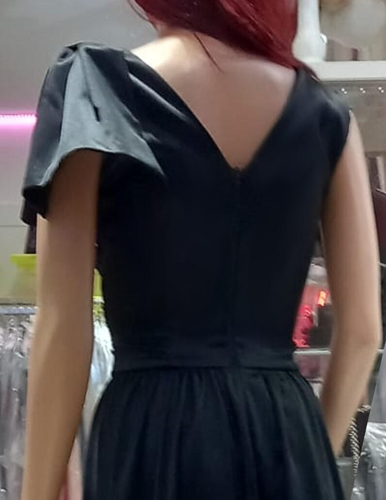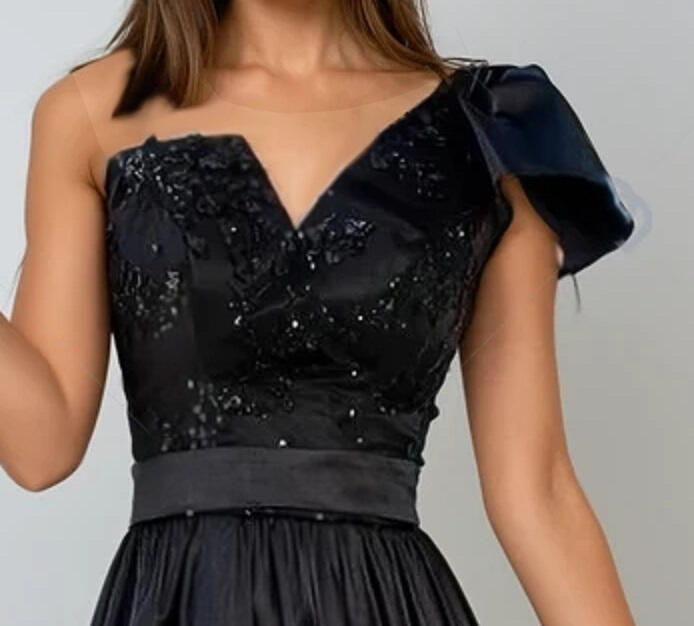 LONG DRESS IN HIGH QUALITY LIGHT SATIN WITH SIDE SPLIT AND VERTICAL STITCHING WITH BODICE EMBROIDERED WITH BLACK MICRO SEQUINS AND NUDE EFFECT BEADS ON THE RIGHT SIDE OF THE BODICE WITH TRANSPARENT TULLE THAT HOLDS THE NECKLINE OUT OF SIGHT WHEN WORN, SATIN BOW ONLY PINNED WITH LIGHT STITCHING ON THE LEFT SIDE OF THE SHOULDER STRAP, EASY TO REMOVE IF YOU DON'T WANT IT.BACK ZIP AND SATIN BELT INCLUDED.PERFECT FIT THANKS TO THE SLIGHT STRETCH OF THE FABRICS