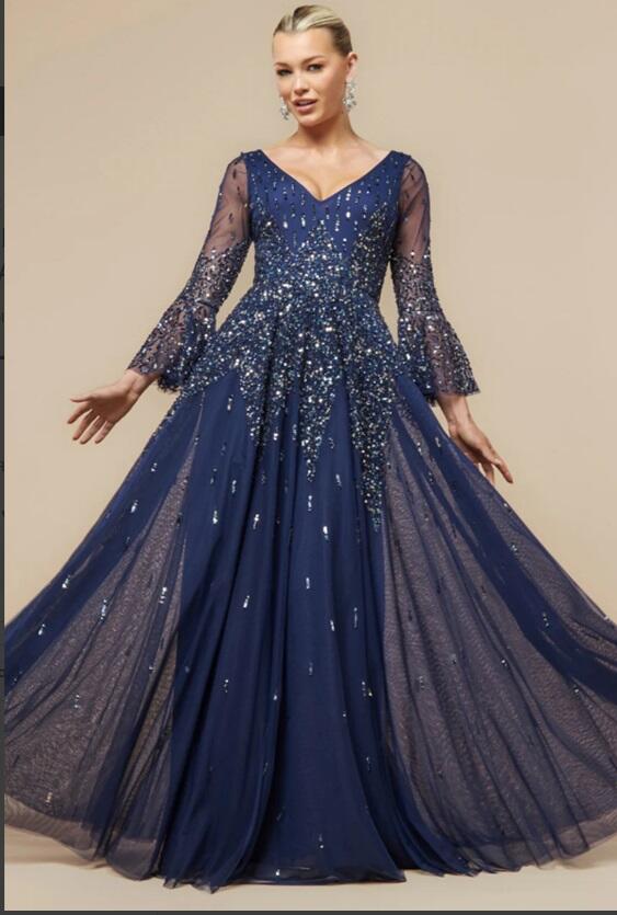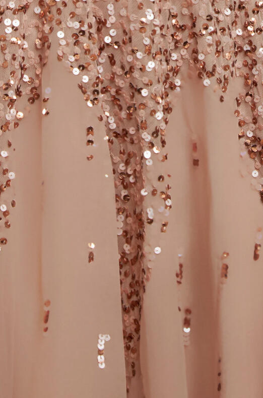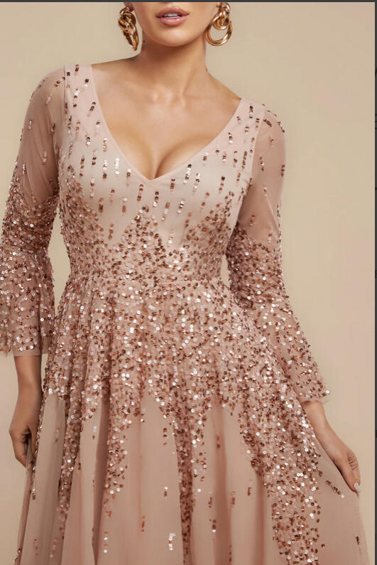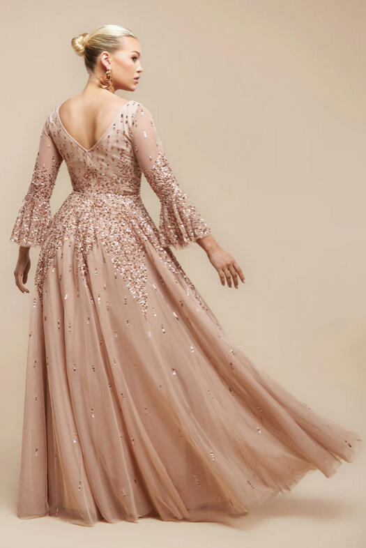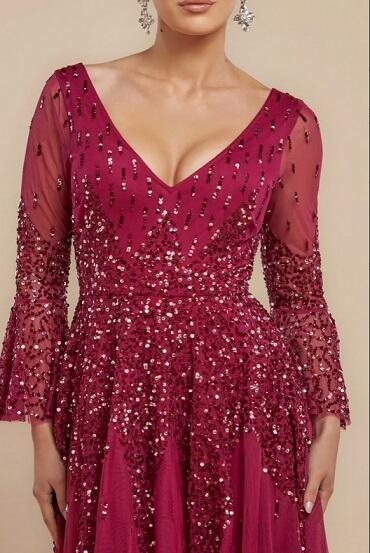 A striking long dress with multicolored sequins. Available in blue with silver sequins, burgundy, and dusty pink with tone-on-tone sequins, sewn onto double-layered tulle and lined with stretch jersey.3/4 sleeves with flared hems and a back zipper make for an extremely elegant dress with a comfortable fit.
