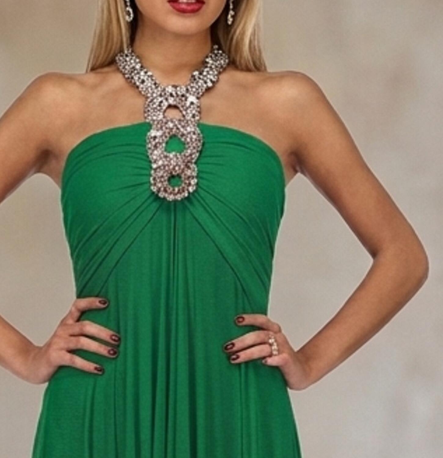 A FASCIA NEL SENO CON SOSTEGNO AL COLLO IN TESSUTO RICOPERTO DA PAILLETTES ARGENTO CUCITE A MANO. CLIP DIETRO AL COLLO.IMBOTTITURA ESTRAIBILE NEL SENO.