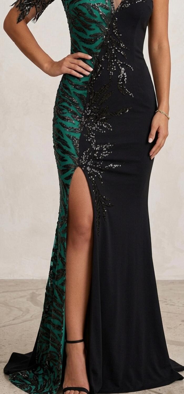 elastico crèpe di alta qualita'con la parte destra doppiata con fodera elastica con colore a contrasto sotto un bellissimo e ricchissimo tulle trasparente ricamato con paillettes nere che salgono su tutta la spalla destra con una mezza manichetta aperta sotto e tulle trasparente sul lato sinistro, per dare l'effetto nudo sul lato opposto. spacco alto a destra e schiena coperta leggermente a V con chiusura a zip.
