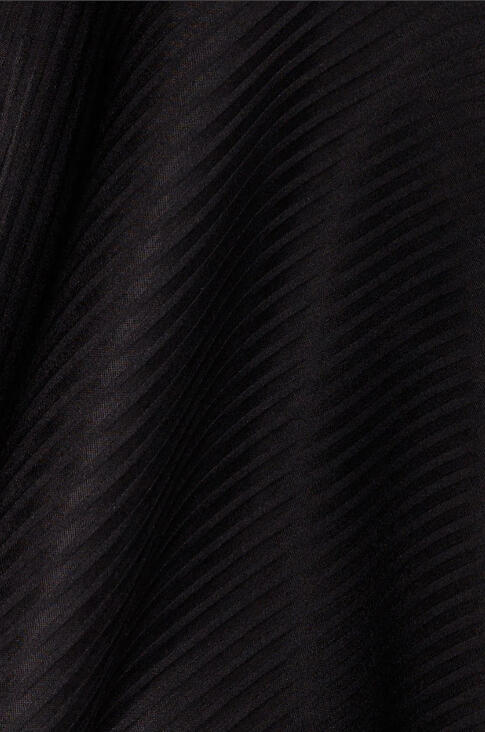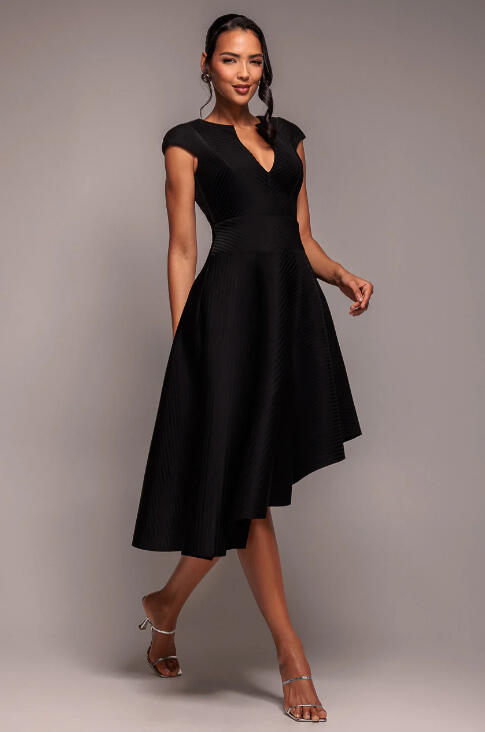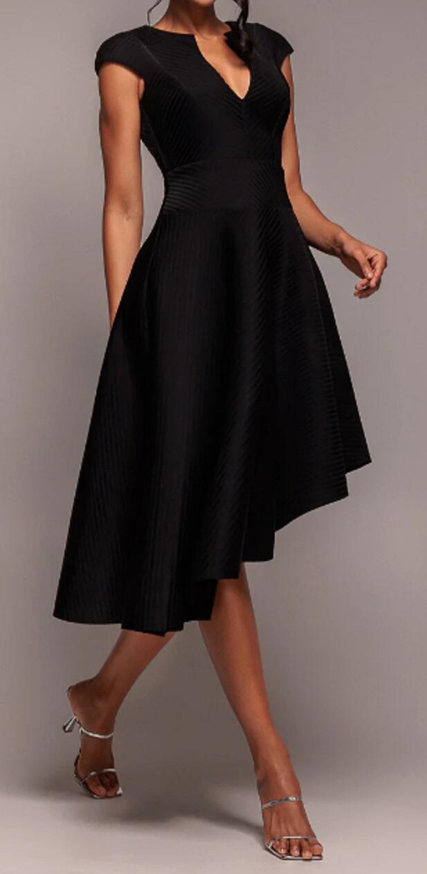Abito a bambola con taglio asimmetrico a sinistra piu' corto e a destra piu' lungo, in tessuto tipo popeline a righine rasate molto elegante. Tessuto che resta in posa come si vede in foto e nel video mantenendo la forma a bambolina e l'asimmetria del taglio. Scollatura a goccia . Vestibilità molto elastica e versatile anche nel punto vita. Cerniera posteriore.