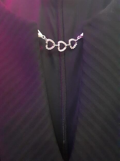 L'abito è dotato di un dettaglio in metallo con strass argento a cuoricini nel punto di chiusura dello scollo, che si può mettere o levare a proprio piacimento in stile collanina di chiusura.