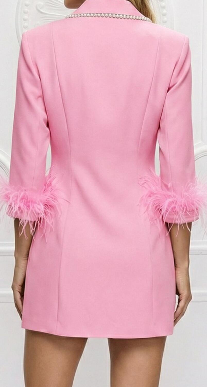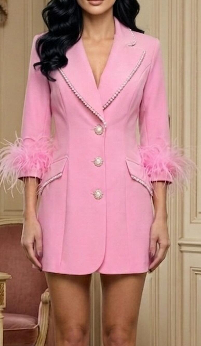 ABITO A GIACCA CON RISVOLTI IN STILE SMOKING COLOR ROSA SHOCKING IN TESSUTO LISCIO DI ALTA QUALITA' TIPO POPELINE CON MANICHE SETTE/OTTAVI E APPLICAZIONI CON PERLINE LUNGO TUTTI I CONTORNI DELL'ABITO. VERE PIUME NEL FINALE DELLE MANICHE