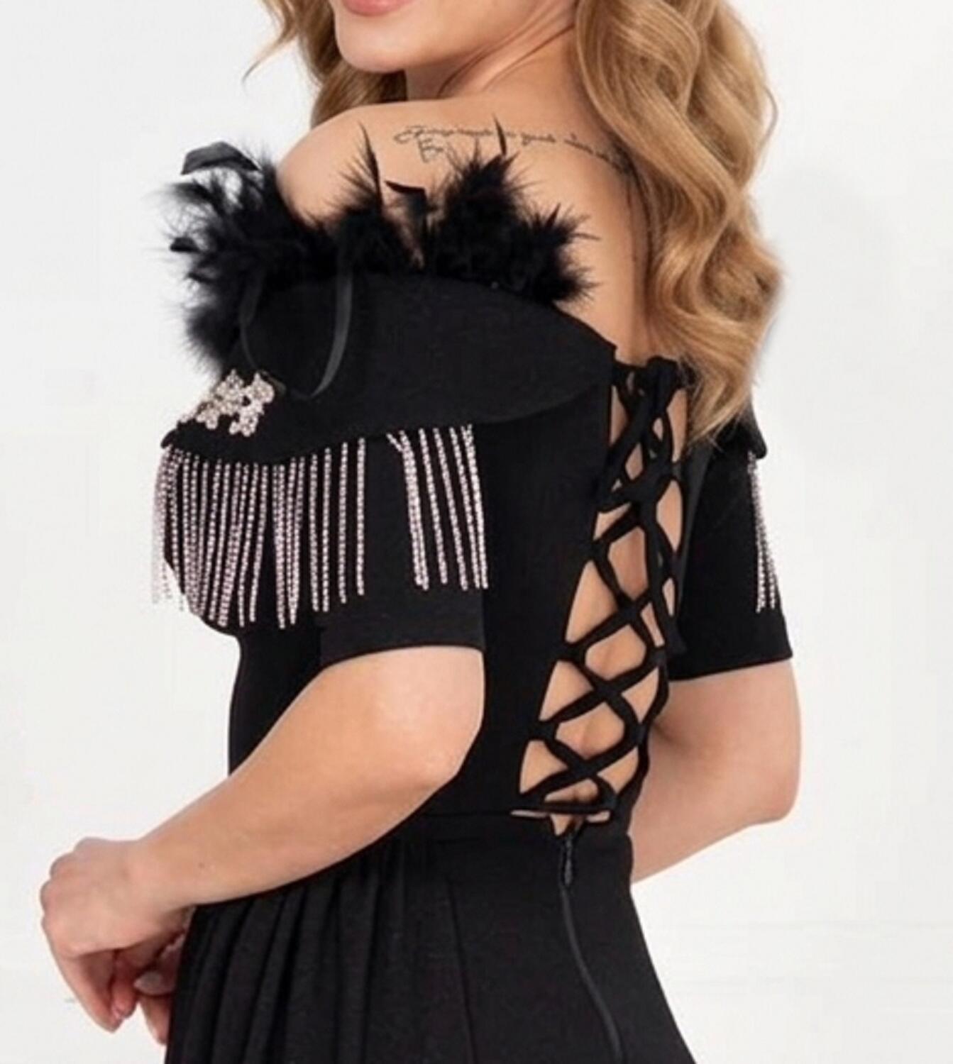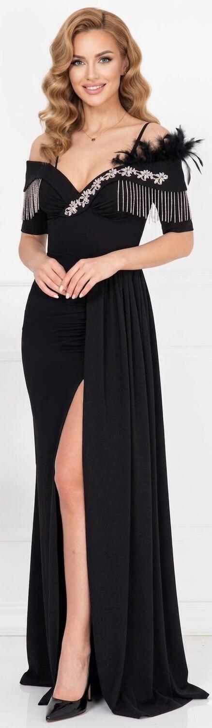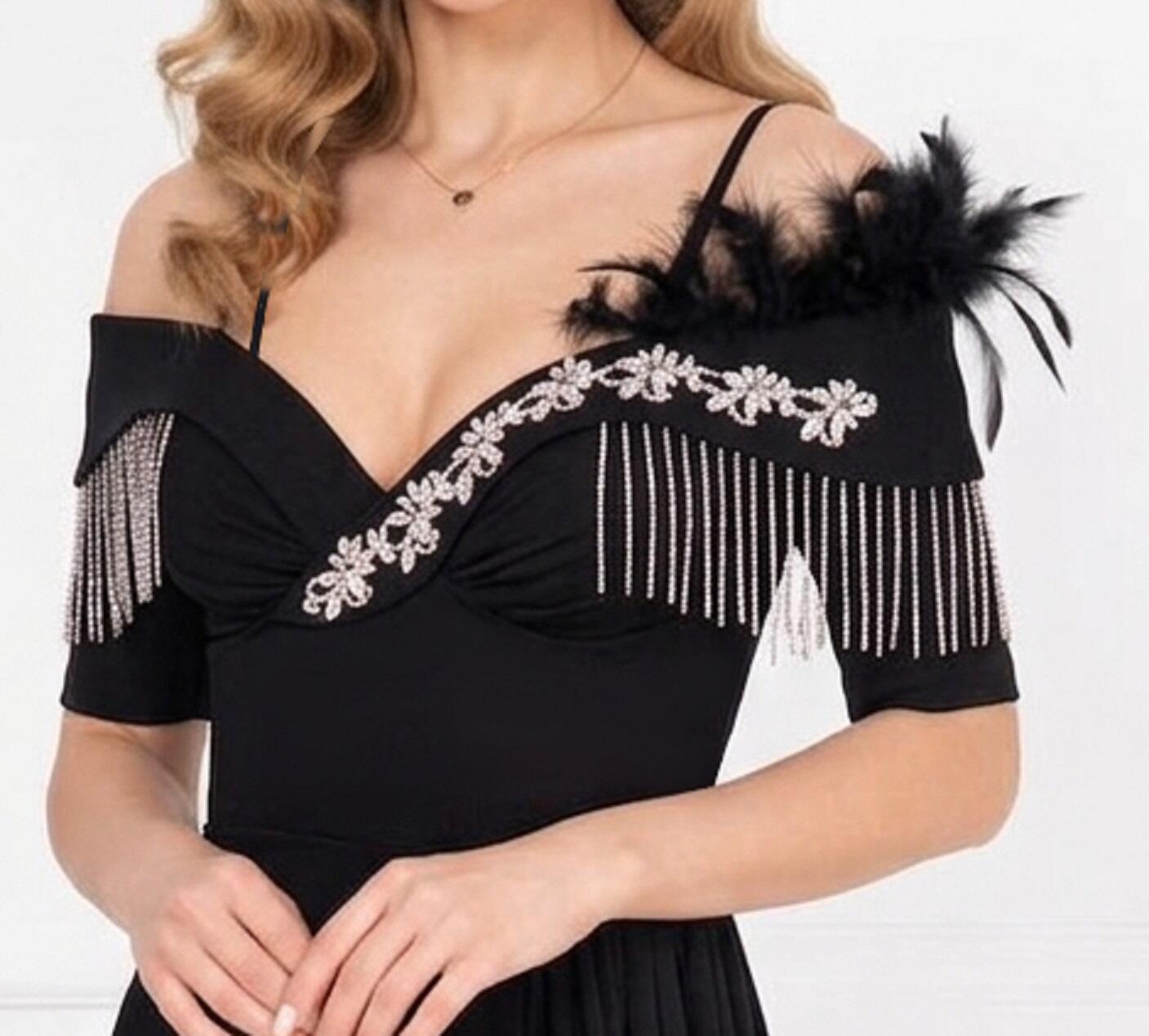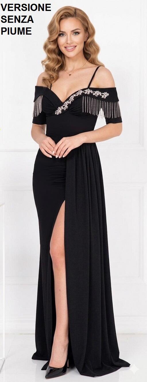 ABITO LUNGO IN TESSUTO CREPE ELASTICO CON PARTICOLARI DETTAGLI NELLA PARTE DELLA SCOLLATURA IN METALLO E STRASS DI ALTA QUALITA'. PARTICOLARE DESIGN CON PANNELLO LATERALE, SPACCO A SINISTRA PARZIALMENTE COPERTO DAL PANNELLO SCOLLATURA A CUORE CON 2 MINI MANICHETTE E SPALLINE CHE SI APPOGGIANO SULLA STRUTTURA DELLE SPALLE, SPALLINE SOTTILI REGOLABILI A SOSTEGNO DELL'ABITO E COPPETTE GIA INSERITE PER ESSERE INDOSSATO SENZA SEGGISENO. LA PARTE POSTERIORE E' CARATTERIZZATA DALLA CHIUSURA A CORSETTO CON PICCOLA CERNIERA E LACCINI IN RASO REGOLABILI CHE RENDONO L'ABITO MOLTO VERSATILE PER OGNI CONFORMAZIONE . VERE PIUME SUL BRACCIO SINISTRO.