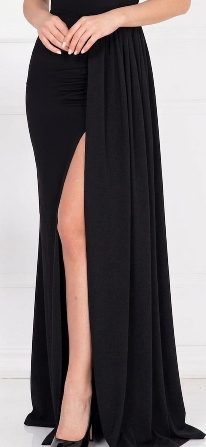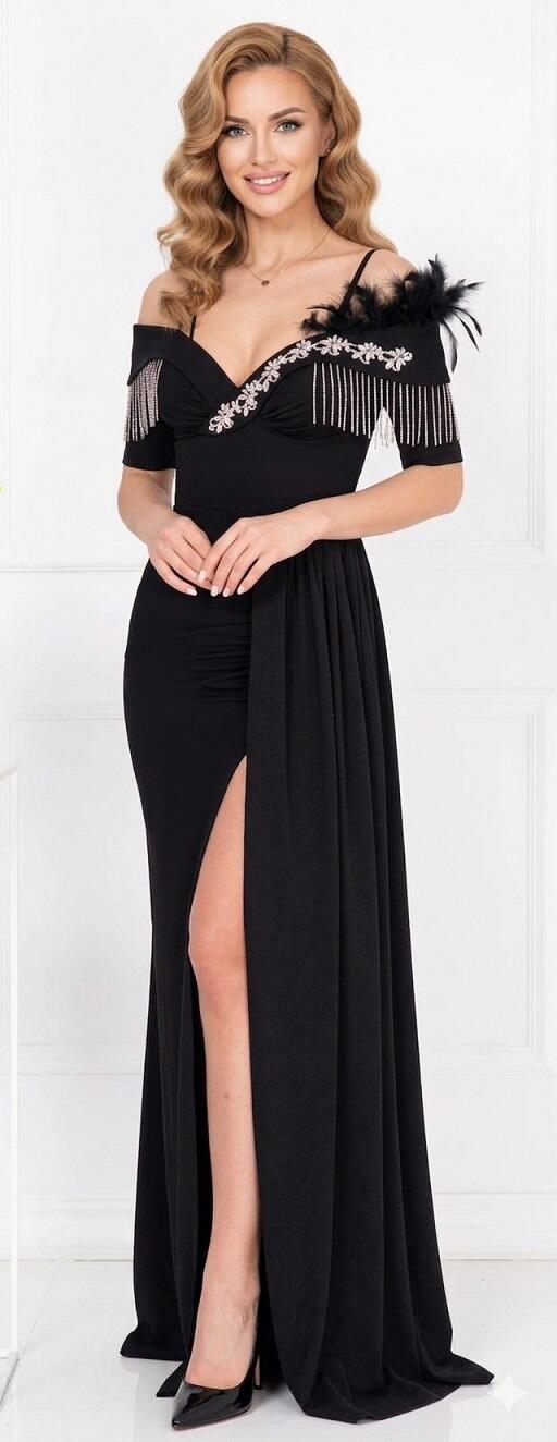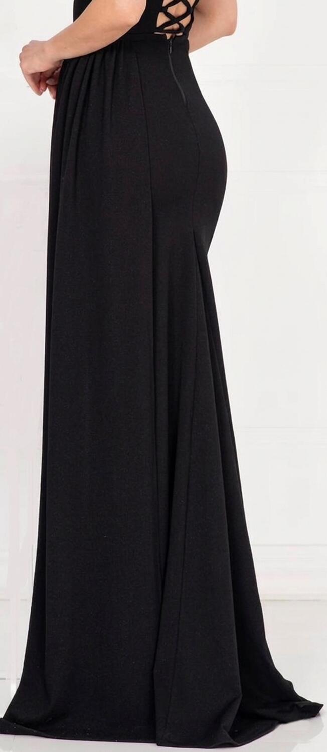 ABITO LUNGO IN TESSUTO CREPE ELASTICO CON PARTICOLARI DETTAGLI NELLA PARTE DELLA SCOLLATURA IN METALLO E STRASS DI ALTA QUALITA'. PARTICOLARE DESIGN CON PANNELLO LATERALE, SPACCO A SINISTRA PARZIALMENTE COPERTO DAL PANNELLO SCOLLATURA A CUORE CON 2 MINI MANICHETTE E SPALLINE CHE SI APPOGGIANO SULLA STRUTTURA DELLE SPALLE, SPALLINE SOTTILI REGOLABILI A SOSTEGNO DELL'ABITO E COPPETTE GIA INSERITE PER ESSERE INDOSSATO SENZA SEGGISENO. LA PARTE POSTERIORE E' CARATTERIZZATA DALLA CHIUSURA A CORSETTO CON PICCOLA CERNIERA E LACCINI IN RASO REGOLABILI CHE RENDONO L'ABITO MOLTO VERSATILE PER OGNI CONFORMAZIONE . VERE PIUME SUL BRACCIO SINISTRO.